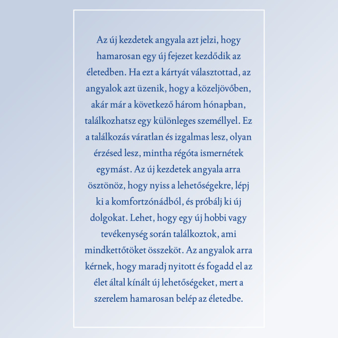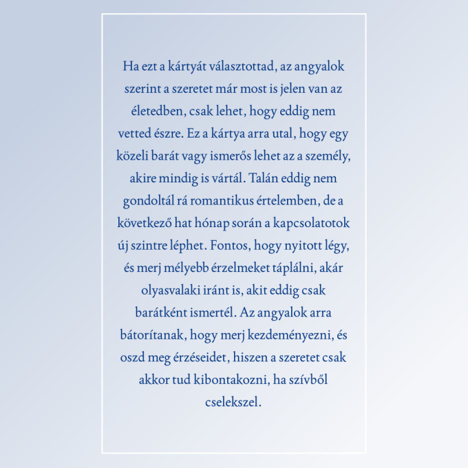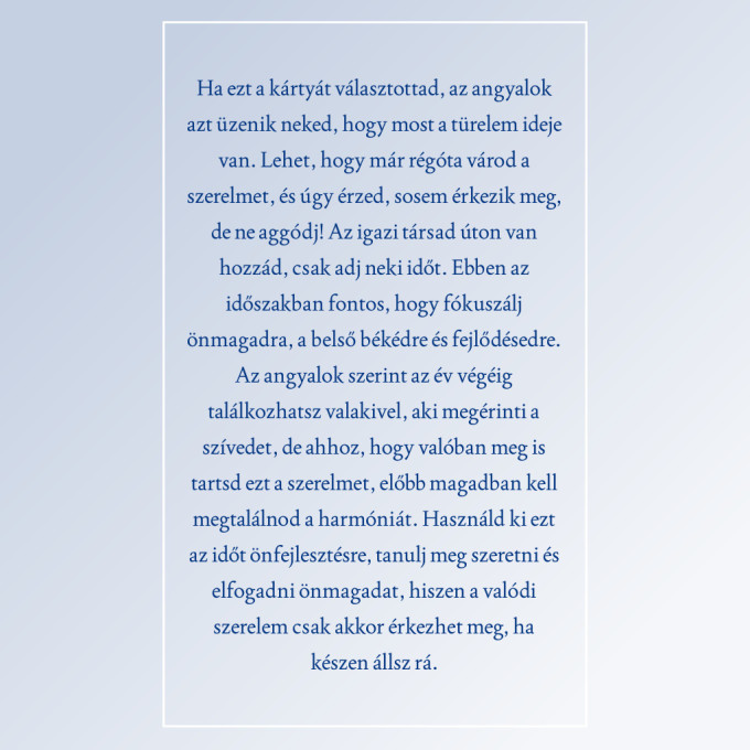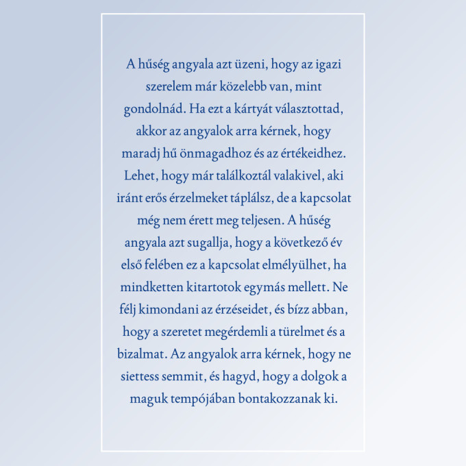Most pedig csukd be a szemed egy pillanatra, vegyél egy mély levegőt, és gondolj a szerelemre. Képzeld el, milyen érzés lenne, ha melletted lenne az az ember, akire mindig is vágytál. Engedd, hogy a szíved vezessen, majd nyisd ki a szemed, és válassz egy angyalkártyát a négy közül!